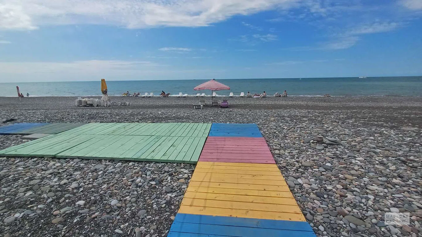 - дорожки с твёрдым покрытием, ведущие к месту, где находятся специальные пляжные коляски и работает обученный персонал;