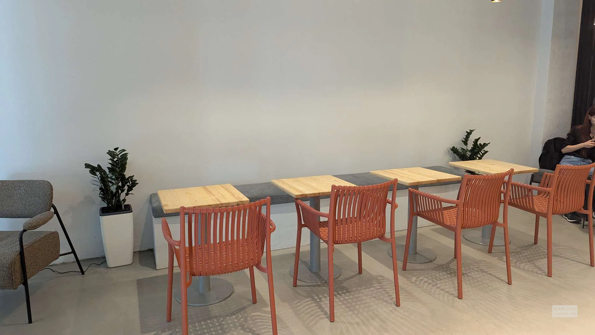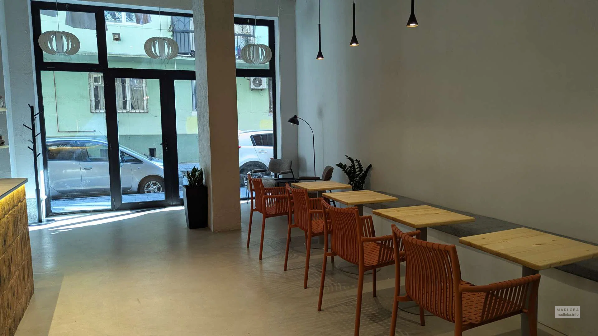 Заведение предлагает кофе на вынос, десерты, выпечку и напитки на растительном молоке. У входа расположены столики на свежем воздухе.