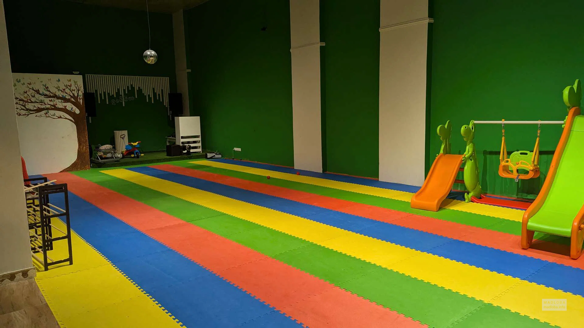 Просторный зал оформлен в ярких цветах, есть детская игровая зона, зона для накрытия столов и фотозона. Центр отлично подходит для мероприятий с аниматорами, мастер-классами, шоу-программами. Родители могут отдыхать за общим столом или участвовать в празднике вместе с детьми.
