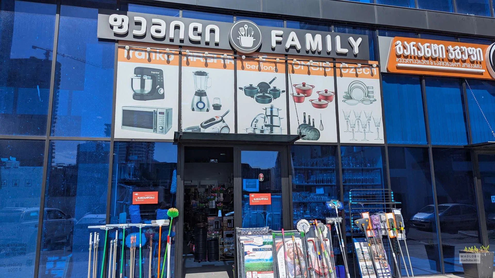 Family — магазин товаров для дома в Батуми, где можно купить всё необходимое для кухни, уборки и быта. В ассортименте представлены посудa, кастрюли, сковороды, стеклянная посуда, кухонная техника (блендеры, микроволновки), а также швабры, ведра, сушилки и хозяйственный инвентарь.
