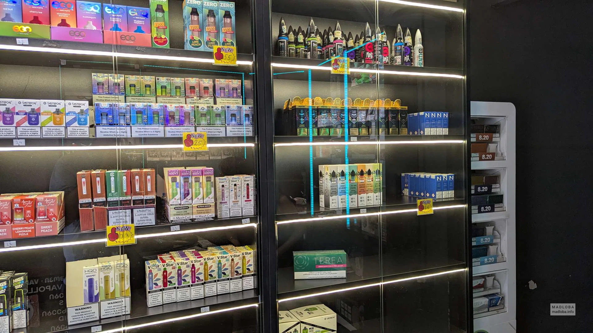 Внутри — современное оформление, хорошо освещённые витрины и разнообразие брендов: Crystal, HQD, VStar, TEREA и другие. Удобная навигация по товарам позволяет быстро найти нужное, а также открыта возможность получить консультацию по выбору вкуса и крепости.