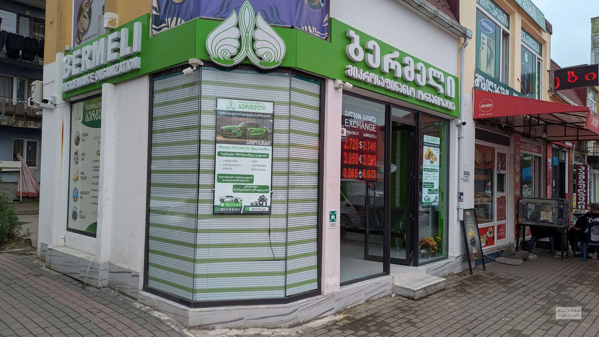 Bermeli — это микрофинансовая организация в Батуми, предоставляющая услуги по выдаче кредитов, обмену валют и финансовому сопровождению. На фасаде офиса расположен электронный табло с актуальными курсами.