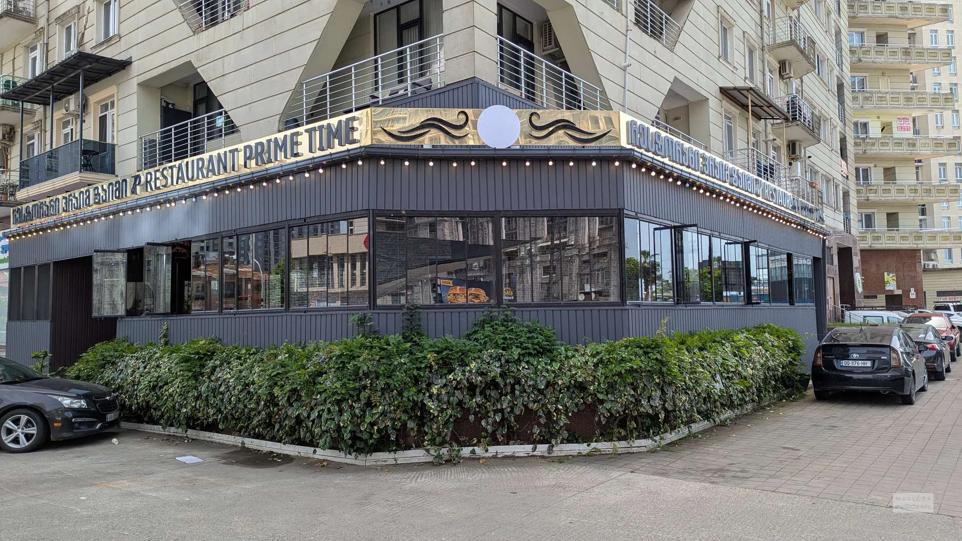 Прайм тайм — ресторан в Батуми с акцентом на мясо, стритфуд и стильный интерьер. Заведение расположено на первом этаже жилого комплекса, с панорамными окнами и неоновой подсветкой по периметру.