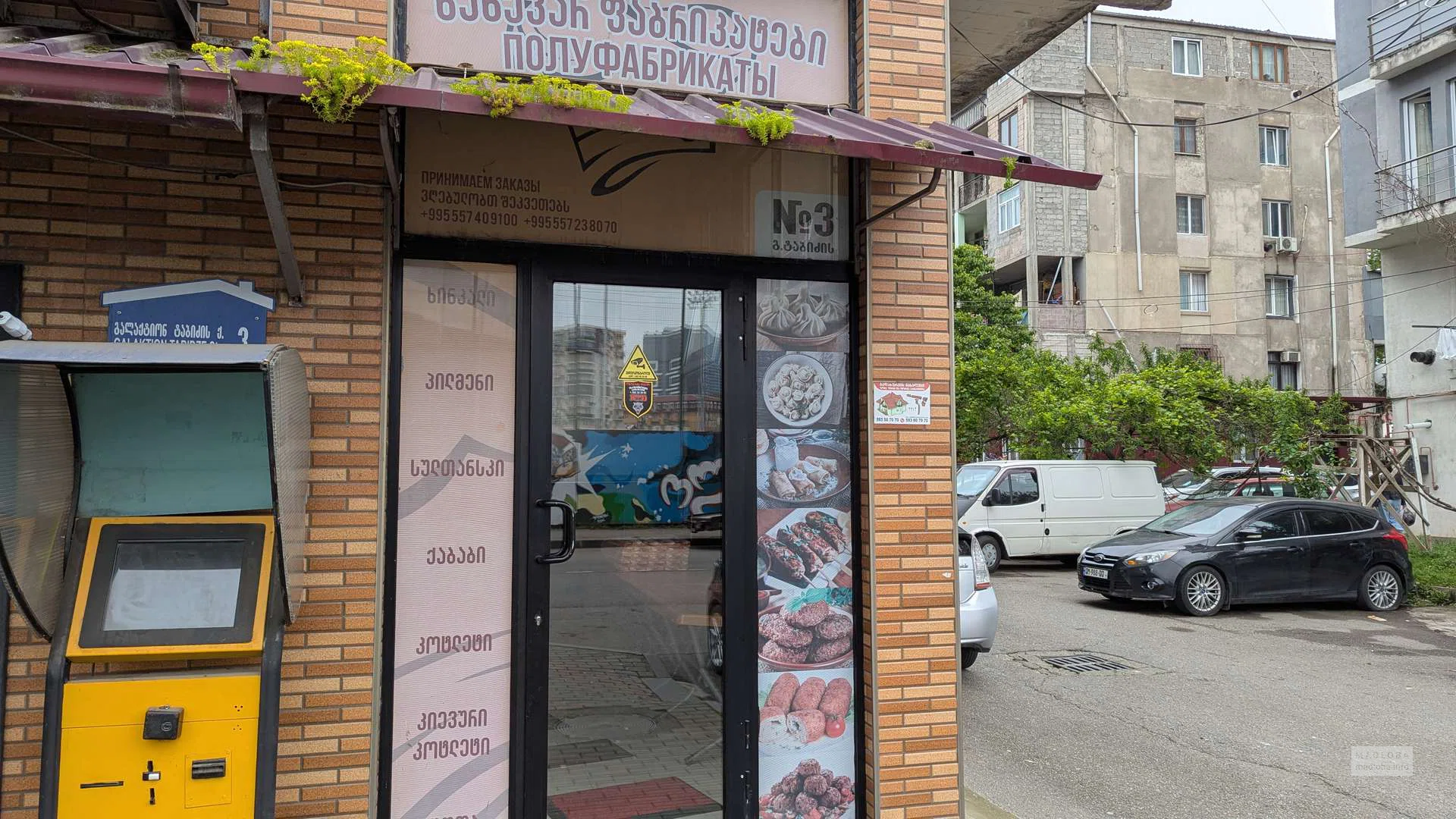 Магазин полуфабрикатов на улице Галактиона Табидзе, 2 в Батуми предлагает свежие хинкали, вареники, пельмени, котлеты и чебуреки. На стекле — меню и изображения продукции, вход через чёрную стеклянную дверь с графиком работы.