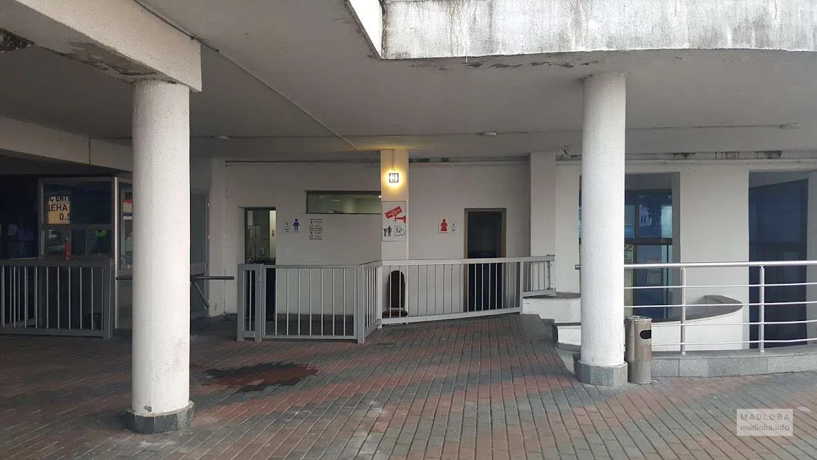 Находится на цокольном этаже, удобно, если спускаться с перрона по правой лестнице (лицом к путям). Работает, стоит всего 1 лари.