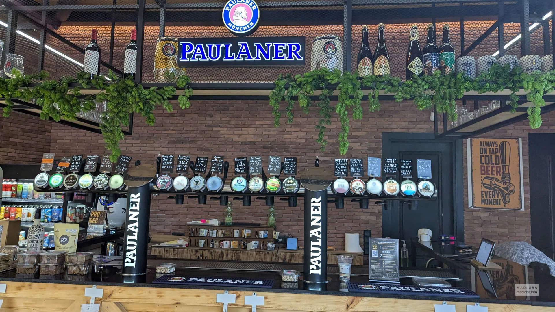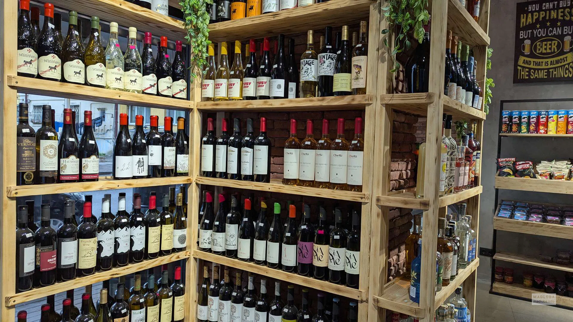 На полках можно найти как грузинские, так и европейские марки — от популярных сортов пива до коллекционного вина и крафтовых напитков. Интерьер выполнен в стиле пивной лавки, а оформление привлекает внимание уютной атмосферой и хорошей выкладкой товара.