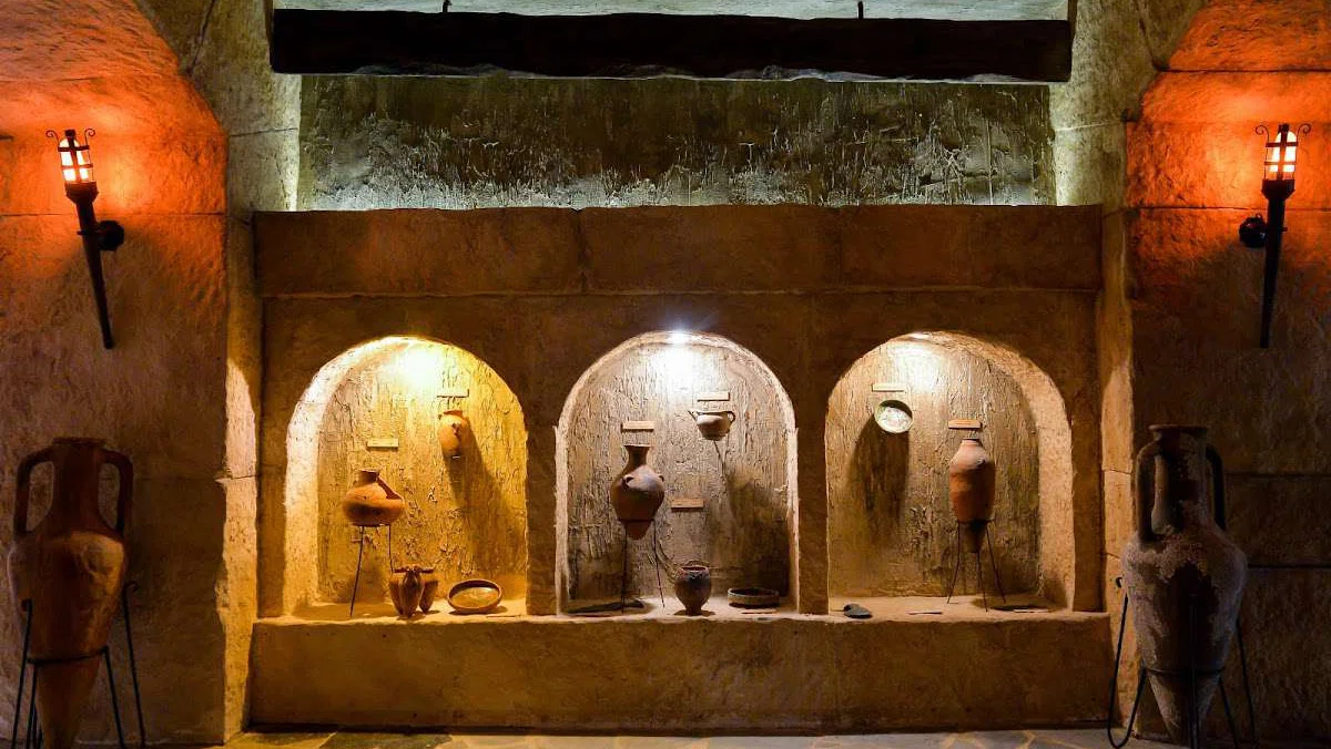 - Артефакты античной керамики и амфоры для перевозки вина.