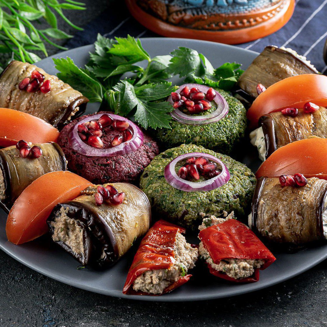I would love to try the eggplant roll with walnuts as a vegetarian appetizer in Georgia; it sounds delicious and unique, especially with the addition of aromatic herbs and pomegranate.