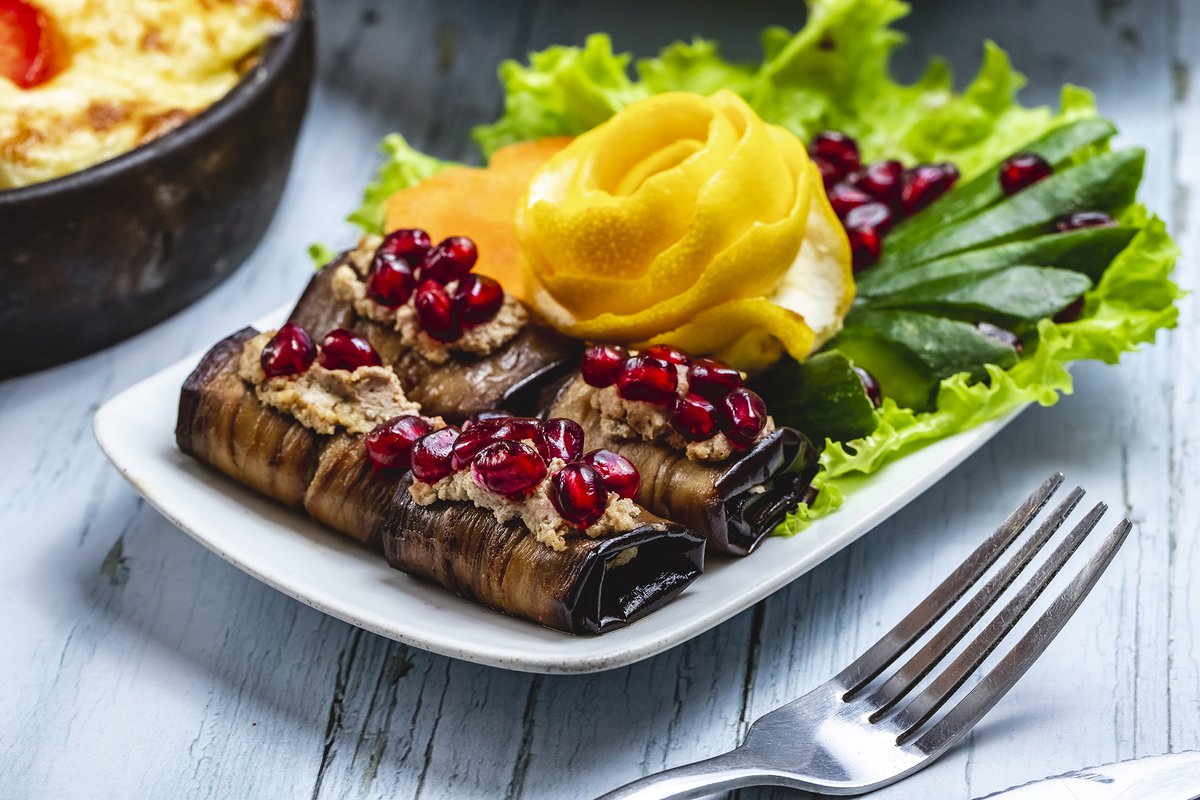 В основе угощения - баклажаны. Начинка может быть совершенно разной, но грецкие орехи и гранат по праву являются главными ингредиентами закуски.