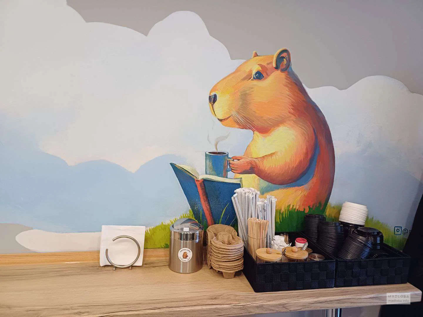 Встретили случайно это милое кафе. Здесь предлагают необычные кофейные напитки, я попробовал кофе с киндером — очень вкусно! Интерьер оформлен с капибарами, и атмосфера невероятно уютная. Отличное место, рекомендую всем.
