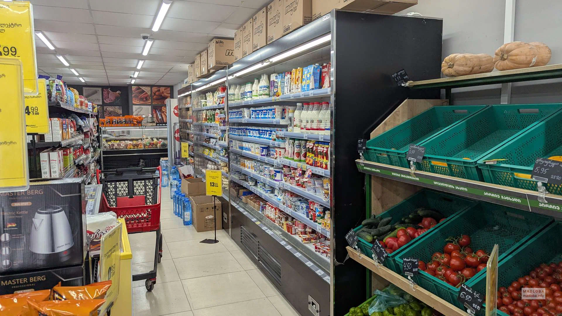 The store offers meat and dairy products, baked goods, fresh vegetables and fruits, drinks, as well as ready-made meals that you can take with you. It is open 24 hours, there are self-service checkouts and refrigerators with ready-made salads and snacks.