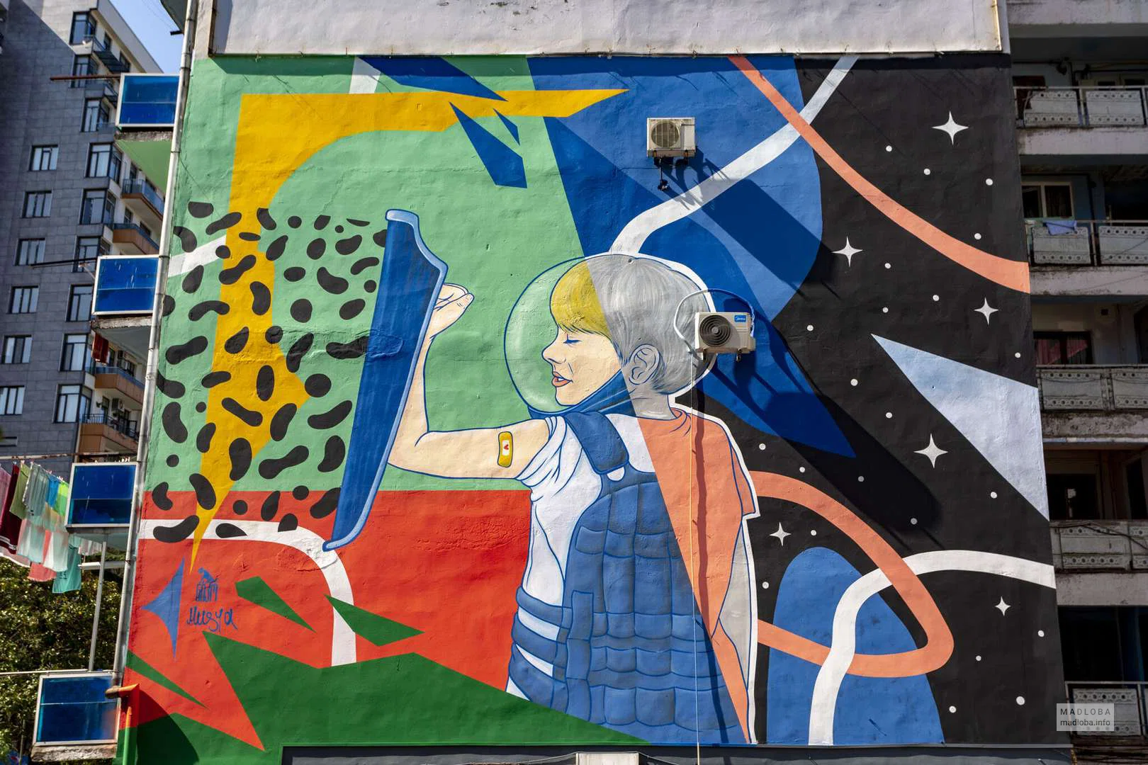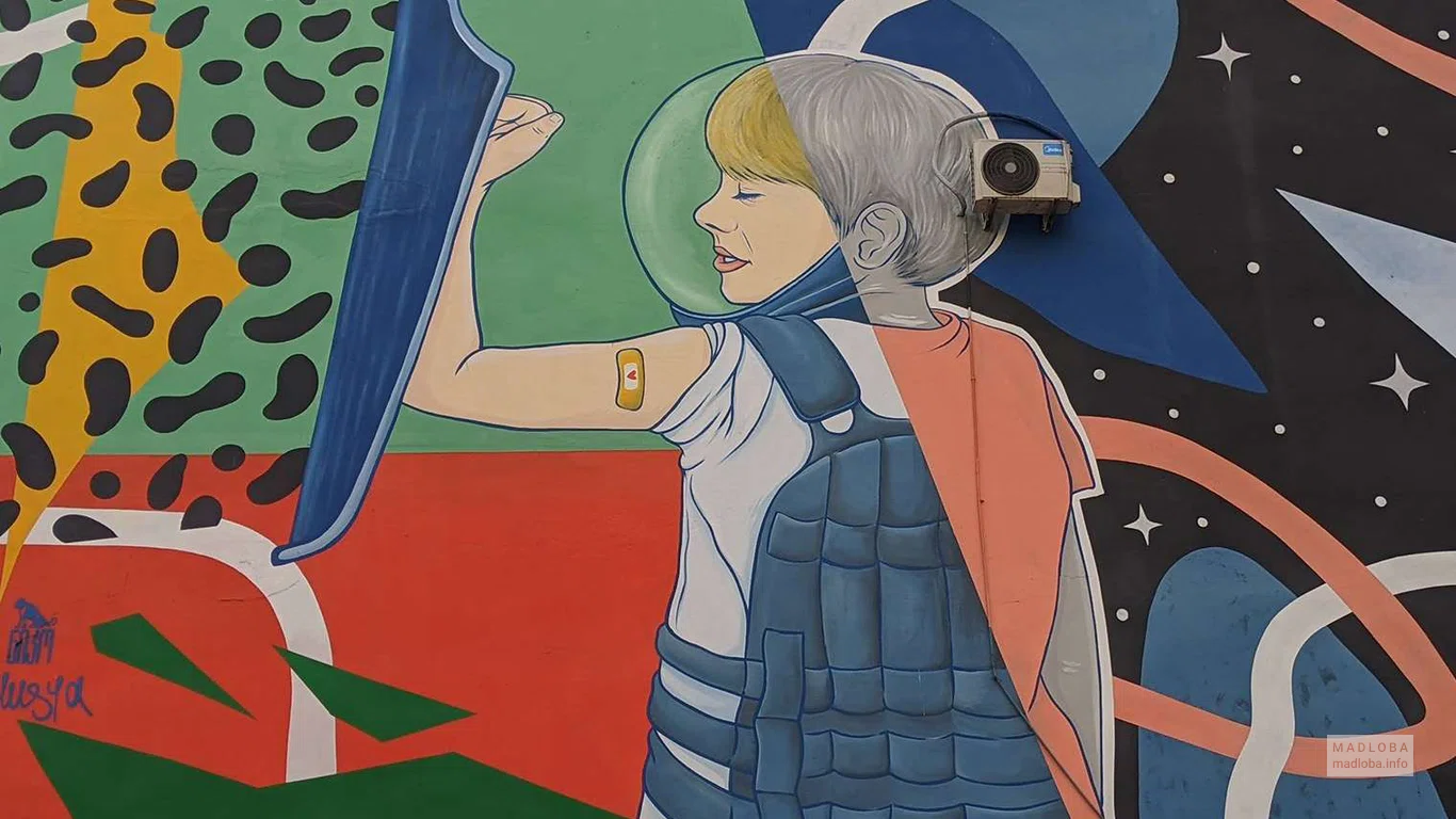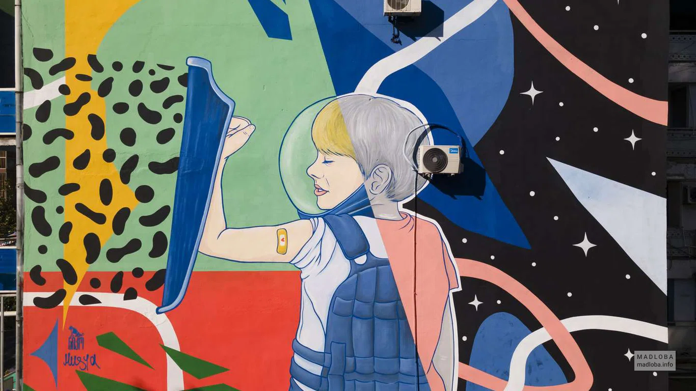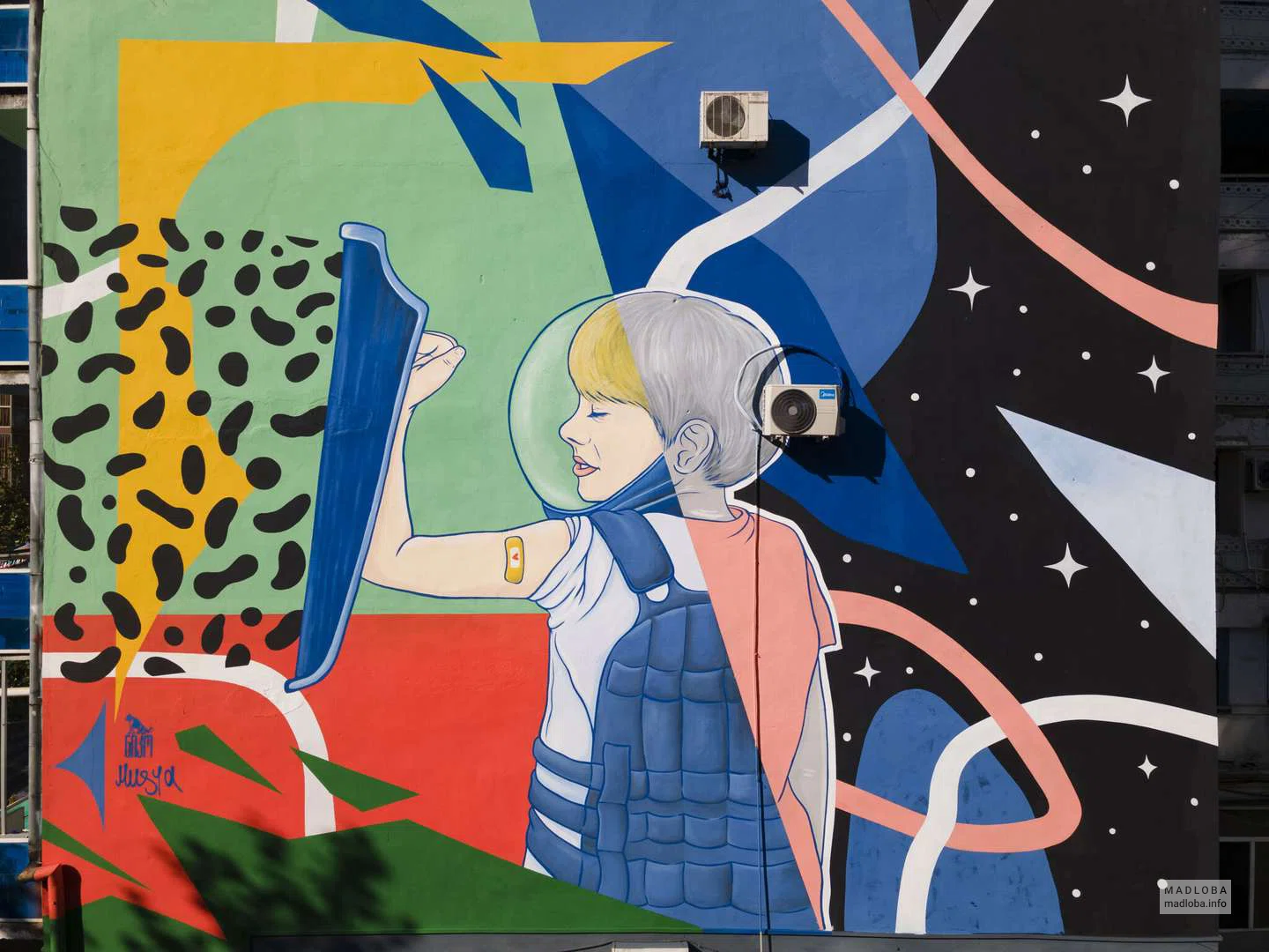 At first glance at the mural “Vaccinated Boy,” it seems that we are looking at a bright, sincere childhood dream about space and stellar adventures. However, penetrating deeper into the meaning of the work, it becomes clear that this is not just a boy in a space suit. This is a symbol of protection, reliability and faith in science through vaccination. The shield and spacesuit on the boy symbolize the body’s reliable protection from external threats, and the black spots flying around remind us of the enemy with whom the world fought during the coronavirus pandemic. Musya Kveburia uses her art to make an important statement: vaccination is the key to safety and health.