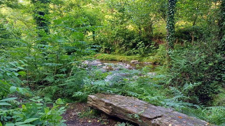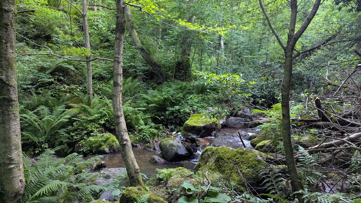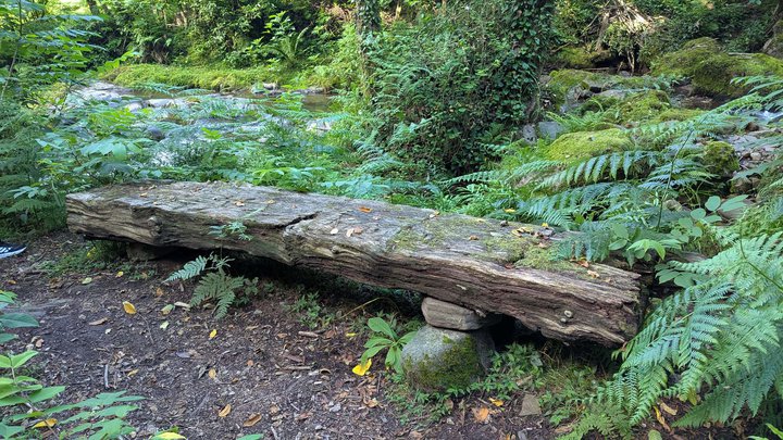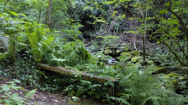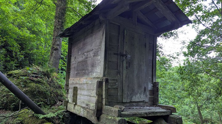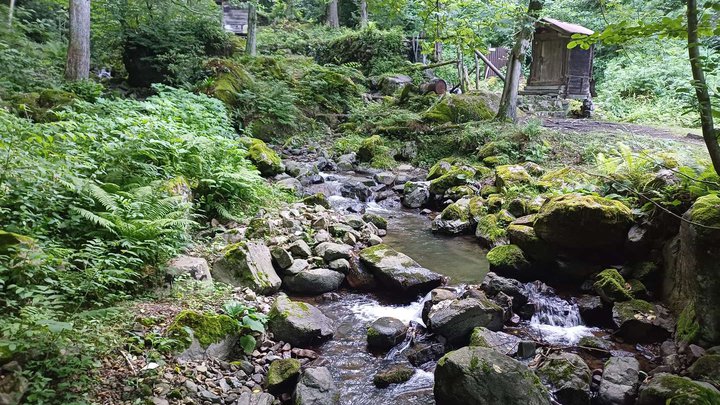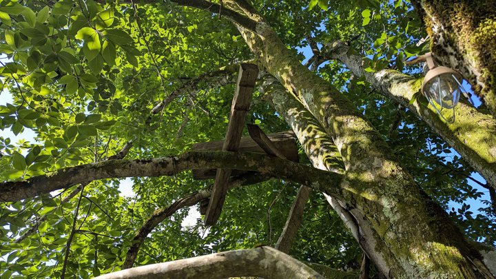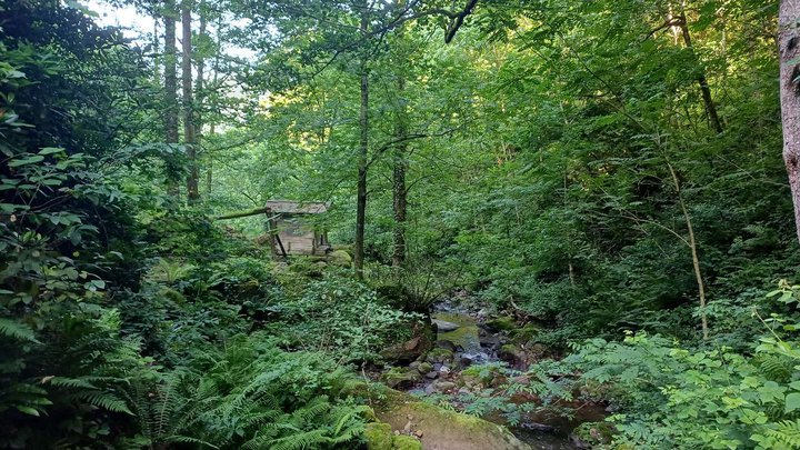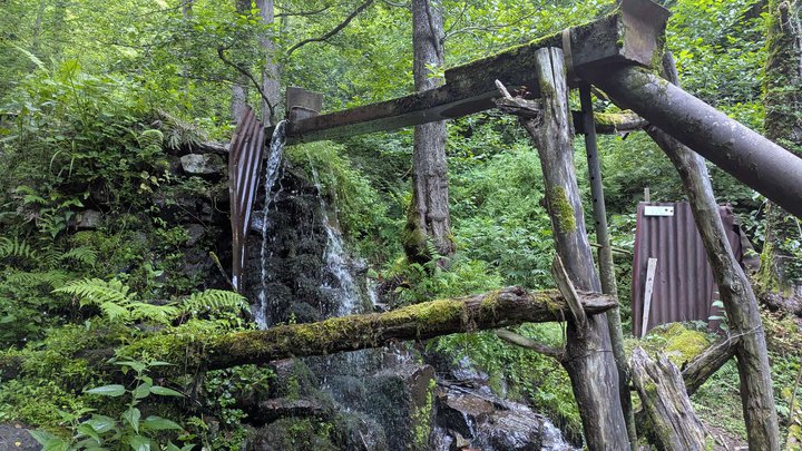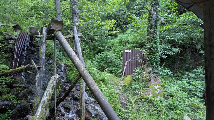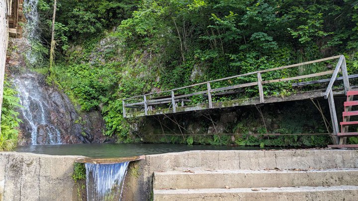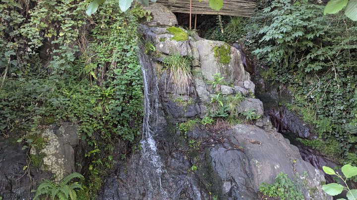 - 🏚 An artificial waterfall with an abandoned mill and a viewing platform on a tree.