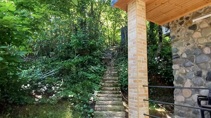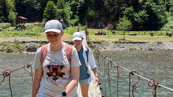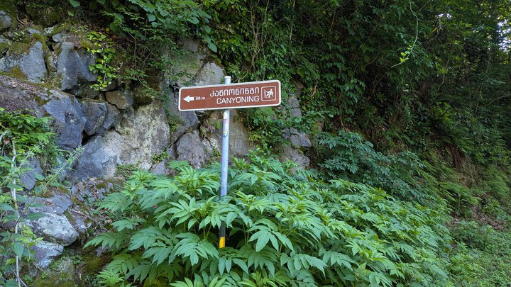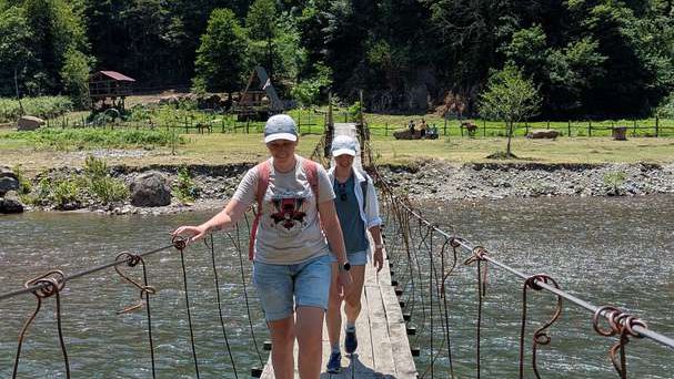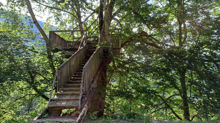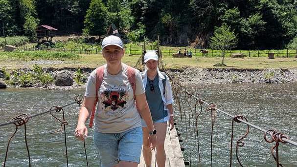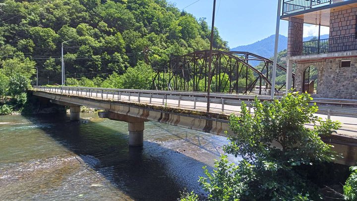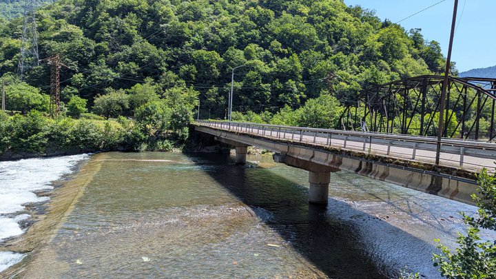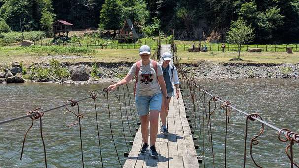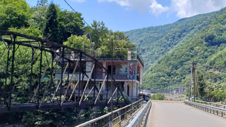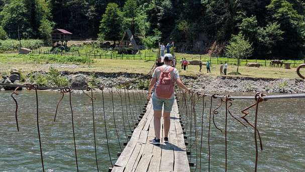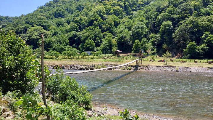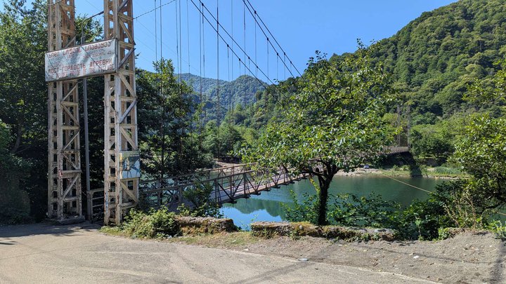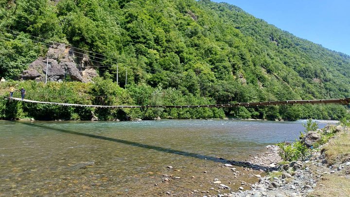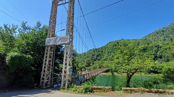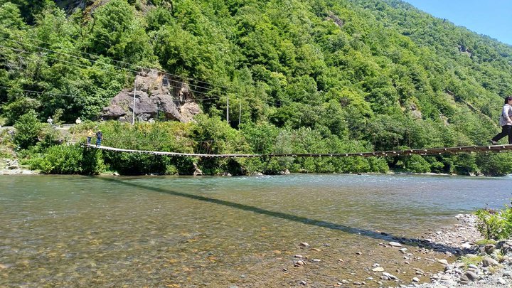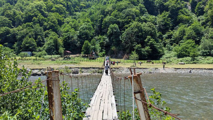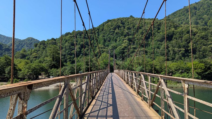 Leave your car at the lower restaurant - it's a couple of minutes' walk to the bridge. This is already the territory of the Machakhela National Park: the bridge is long, slightly swaying, the boards are missing in some places, so hold on to the handrail and do not gather in a crowd (there used to be a sign saying "no more than 4 people"). On the opposite side there are usually locals with horses.