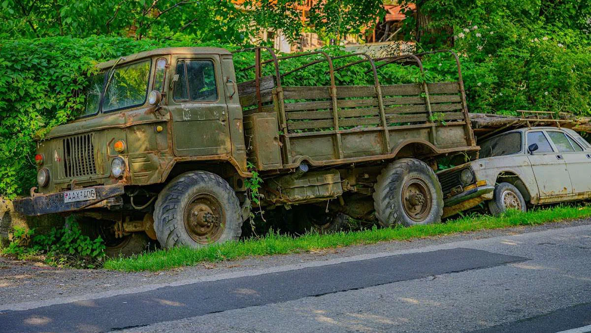 🚙🛠️ Features: Historical Cars and Equipment Covered in Rust and Moss