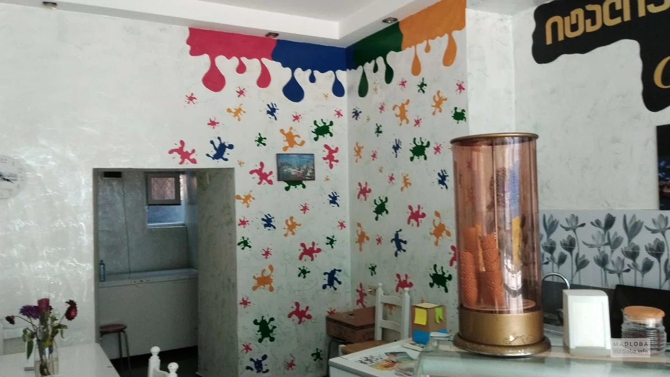კაფეს ინტერიერი ფერად ფერებშია გაფორმებული.