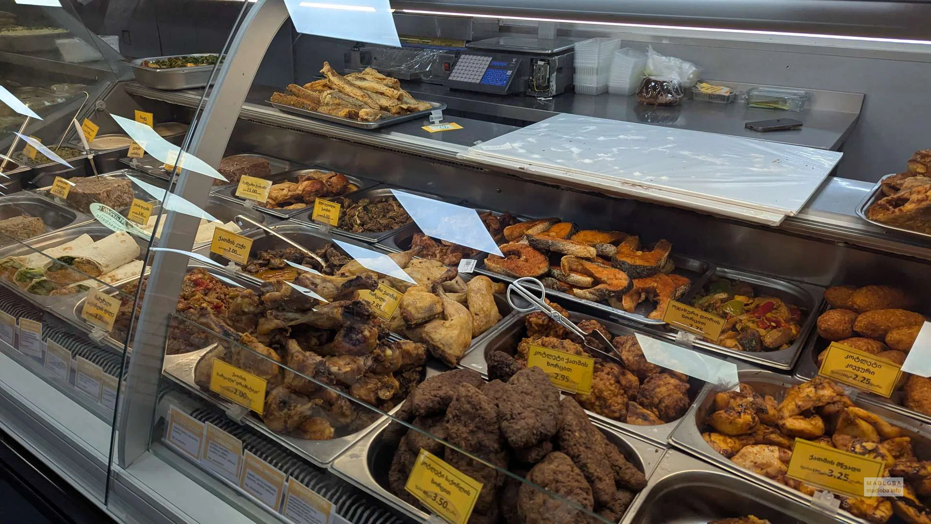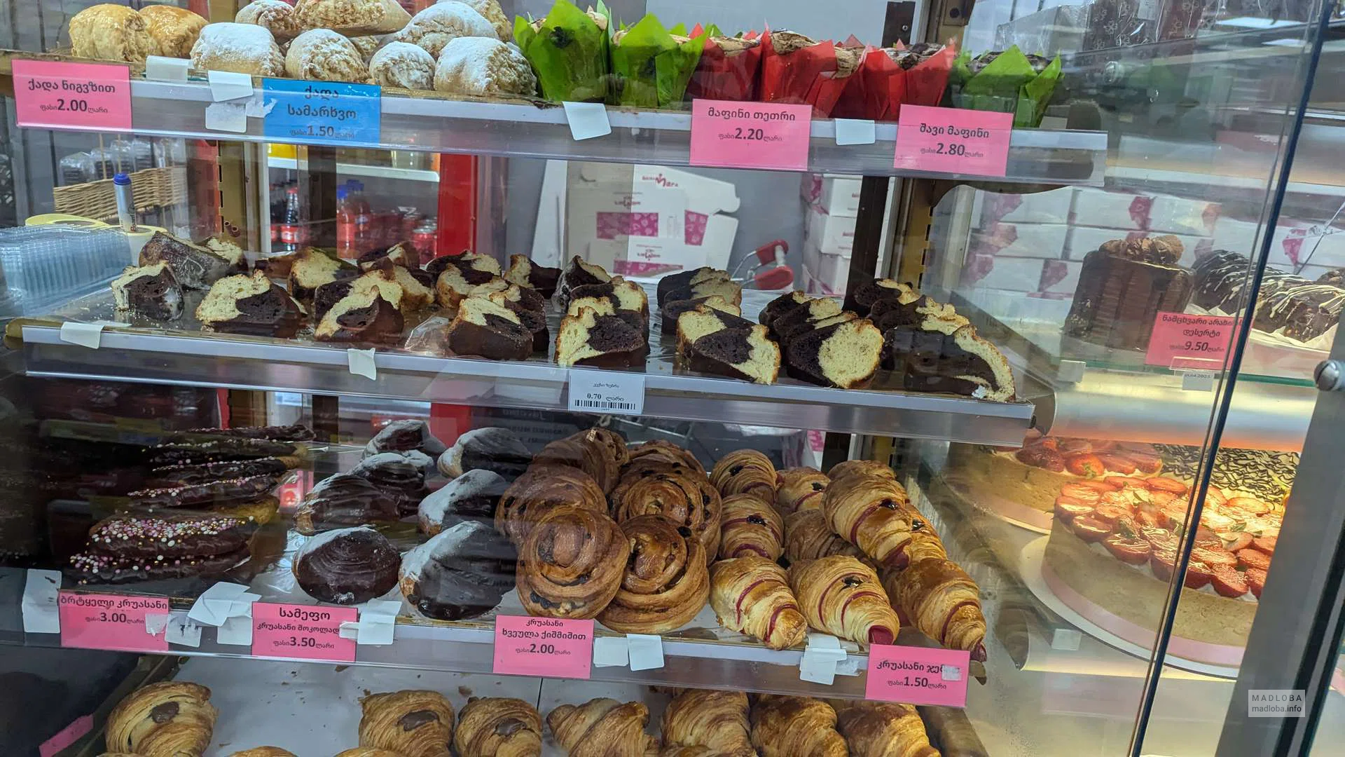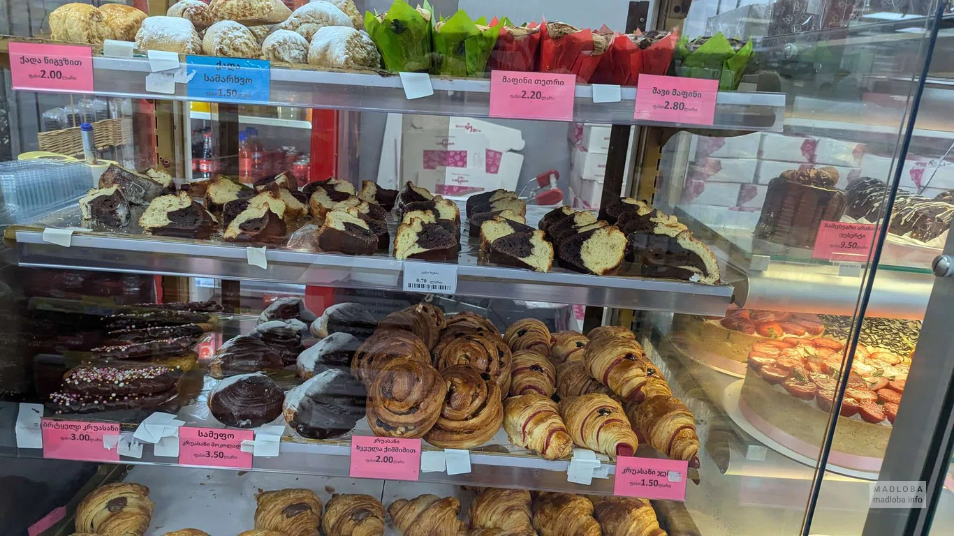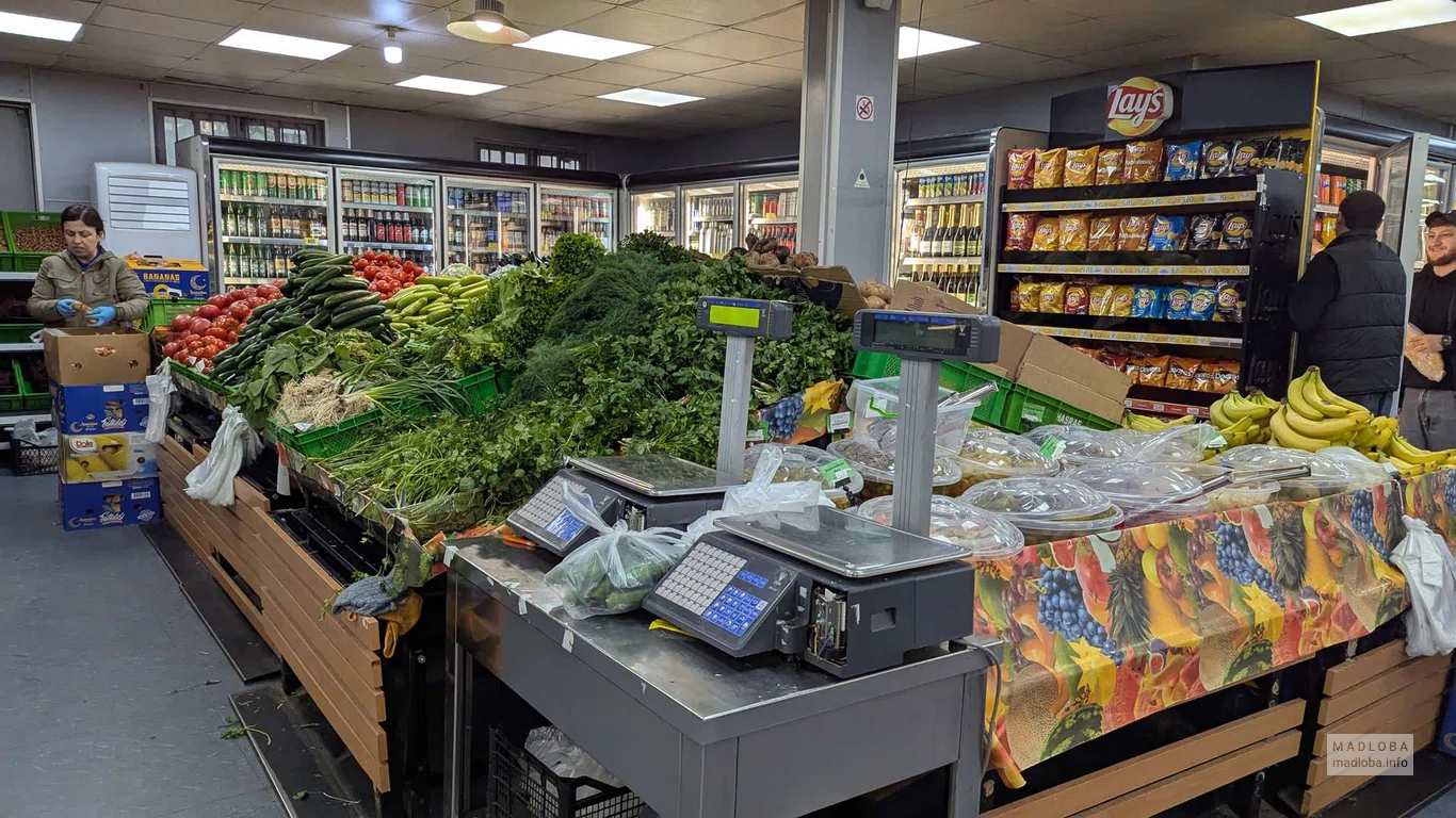 Магазин радует круглосуточной работой и замечательной кондитерской продукцией. Понравился выбор солений на развес, замороженных товаров и разнообразие мясных изделий и сыров. Однако есть неудобство — ценники только на грузинском, что странно для курортного города. Обидно, что качество кондитерских изделий резко контрастирует с неудачной выпечкой, такой как лобиани и хачапури.