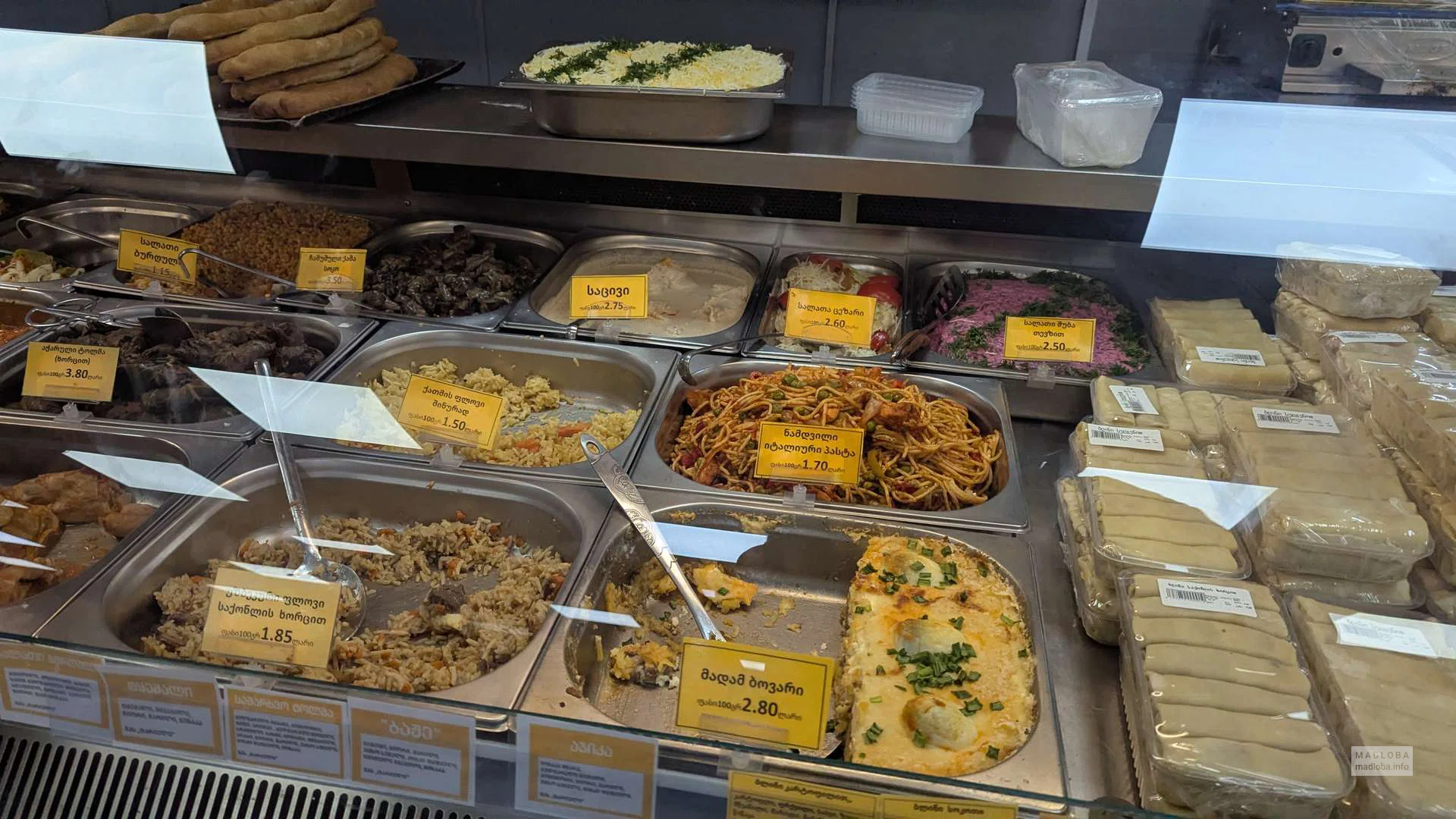 Большой выбор ,свежая выпечка, много различной готовой еды(различные салаты, овощные гарниры,жареное мясо,рыба,котлеты,хачапури,лобиани,картошка фри,по-мексикански…… И т. д.).отличный магазин,всегда туда заходим и покупаем,что любим!