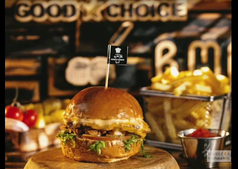 Good Choice Burger მდებარეობს თბილისის ცენტრში და სტუმრებს სთავაზობს ახალი და მაღალი ხარისხის ინგრედიენტებისგან მომზადებულ კერძების ფართო არჩევანს. აქ შეგიძლიათ მიირთვათ მრავალფეროვანი ბურგერი, გვერდითი და გამაგრილებელი სასმელი მყუდრო და თანამედროვე გარემოში.