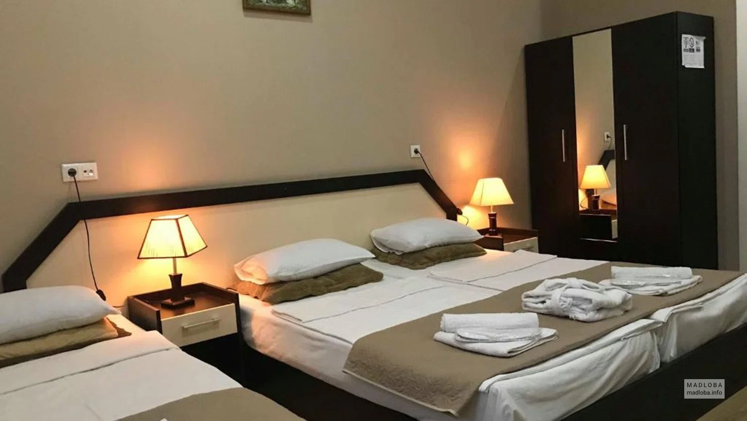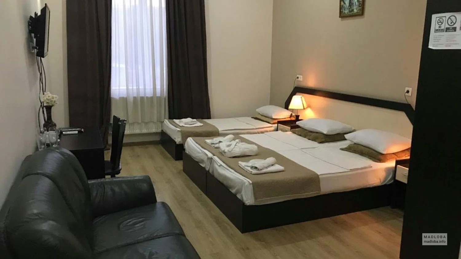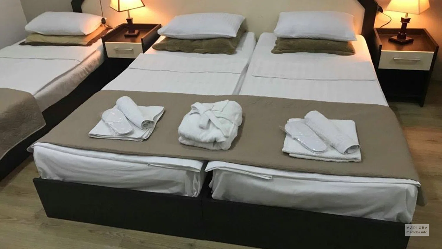 ოთახები გაფორმებულია თანამედროვე არტ ნუვოს სტილში, კრემისფერი და შავი ტონებით, რაც ქმნის ელეგანტურობას და კომფორტს.