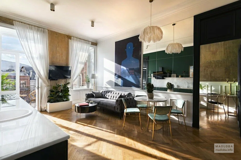 ადგილზე არის რესტორანი და ბარი, რომელიც პოპულარულია არა მხოლოდ სტუმრებში, არამედ ადგილობრივ მოსახლეობაშიც. აქ მიირთმევენ საუზმეს და თანამედროვე ქართულ და ევროპულ სამზარეულოს. სასტუმრო მდებარეობს მეტროსადგურ Ploshchad Svobody-დან სულ რაღაც 550 მეტრში, სუხოის ხიდის ბაზრობის და ათონელის ქუჩის გვერდით. ეს იდეალური ადგილია ძველი თბილისის გარშემო სეირნობისა და გასტრონომიული აღმოჩენებისთვის.
