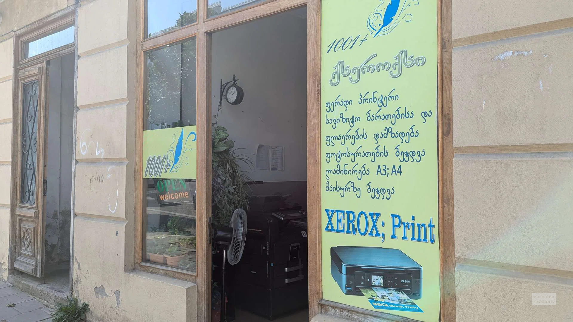 1001+ არის პრაქტიკული ასლის ცენტრი თელავში, მოსახერხებელი ტურისტებისთვის, სტუდენტებისთვის და ადგილობრივი მეწარმეებისთვის. პატარა, მაგრამ აღჭურვილ ოთახში ისინი ასრულებენ დოკუმენტების გადაუდებელ ბეჭდვას, ფოტოკოპირებას, ფერად და შავ-თეთრ ბეჭდვას A4 და A3 ფორმატებში, ასევე სკანირებას.