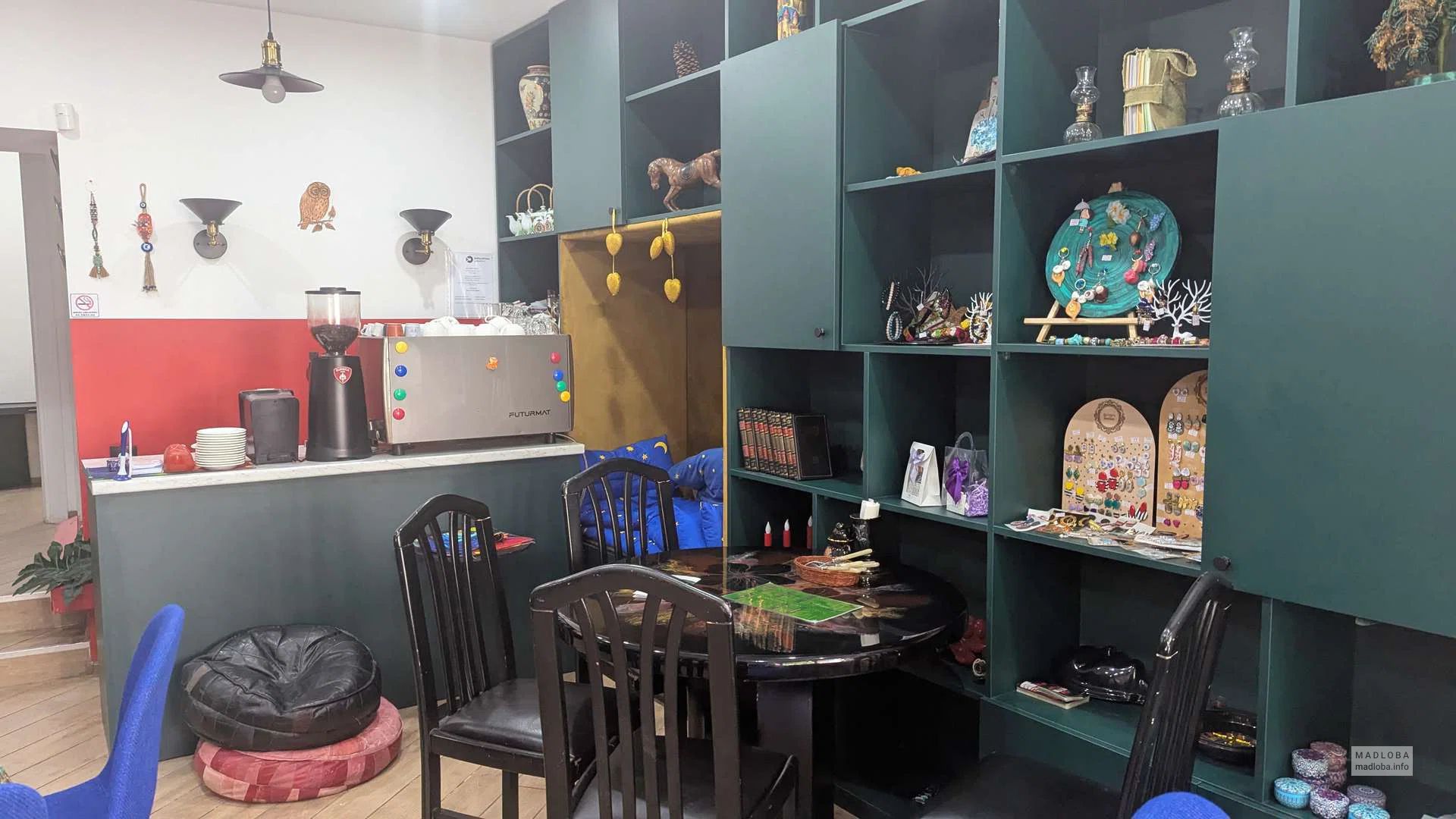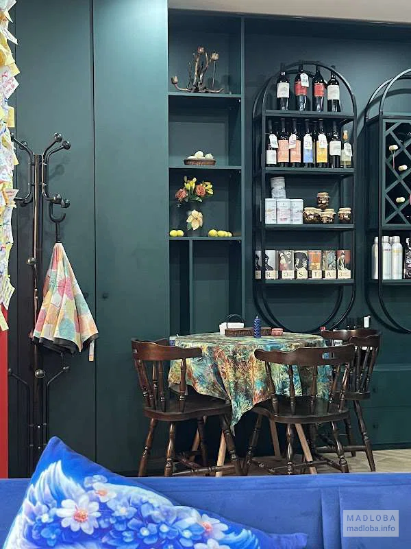 Интерьер оформлен в глубоких зелёных тонах, с деревянной мебелью, расписными скатертями и полками, уставленными вином, чаем и книгами. Внутри — тихо, спокойно, почти по-домашнему. Можно посидеть за чашкой кофе, листая книгу или просто наслаждаясь атмосферой.