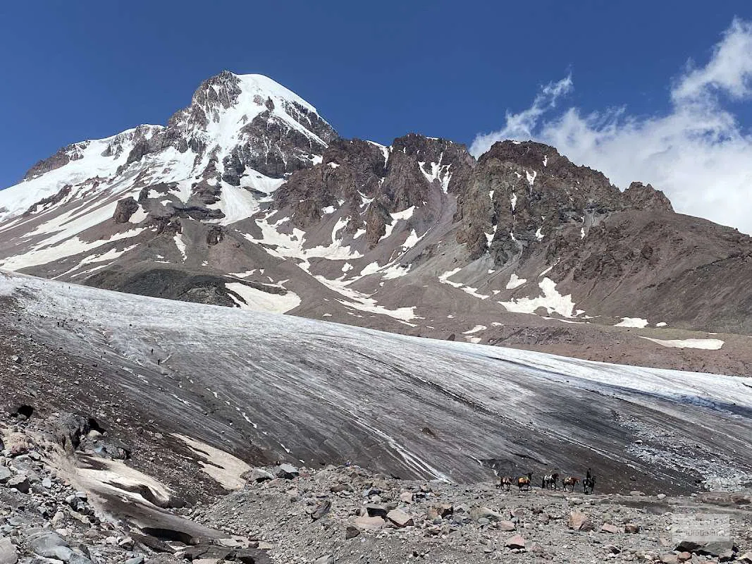 Треккинг к леднику начинается из Степанцминды (Казбеги) и занимает от 8 до 12 часов с набором высоты до 1600 м. Это популярный маршрут среди опытных туристов, хотя можно начать поход от церкви Гергети, чтобы снизить нагрузку.