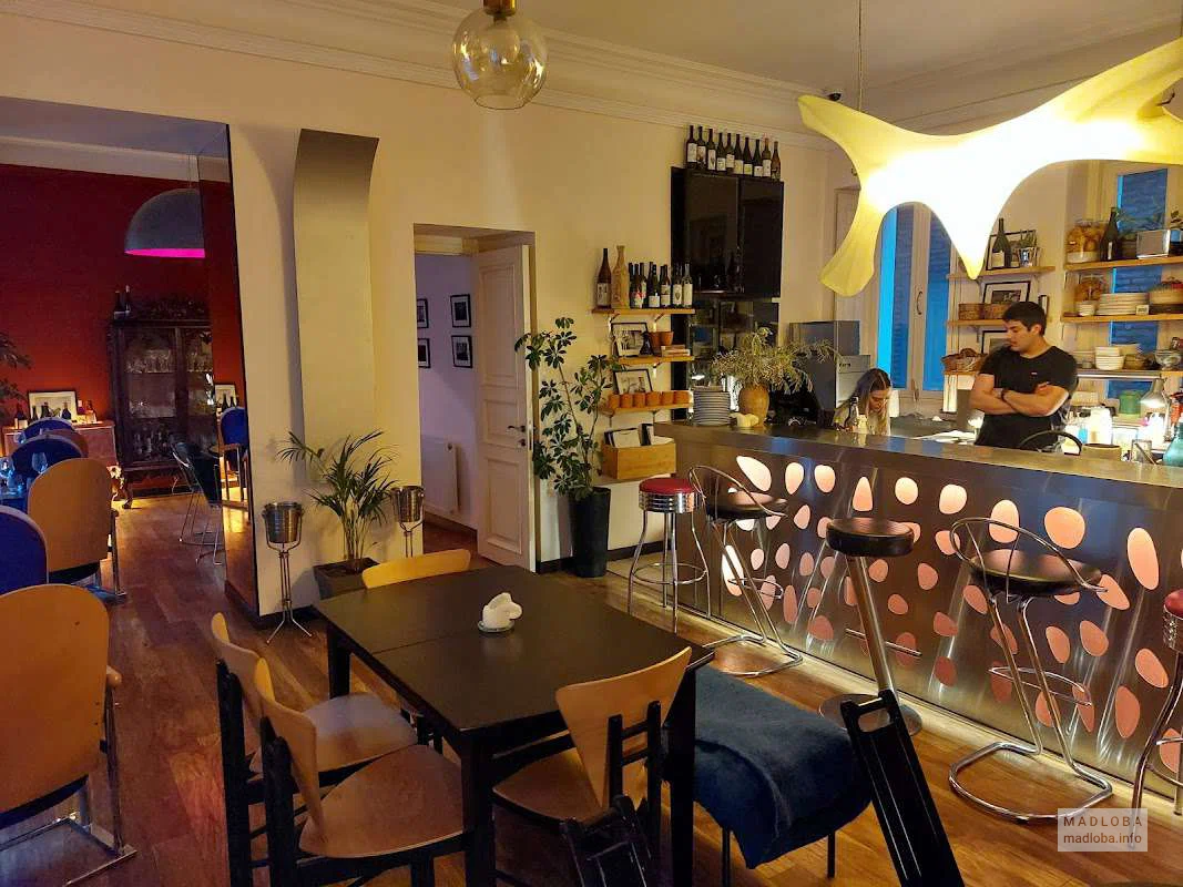 Здесь подают натуральные вина из разных регионов Грузии: амбер, саперави, цицка, мукузани и многое другое. В дополнение — сырные и мясные тарелки, закуски и лёгкие блюда. Обслуживание внимательное, интерьер — в европейском стиле с грузинским акцентом. Полки с бутылками, мягкий свет, немного джаза — всё располагает к неторопливому общению.