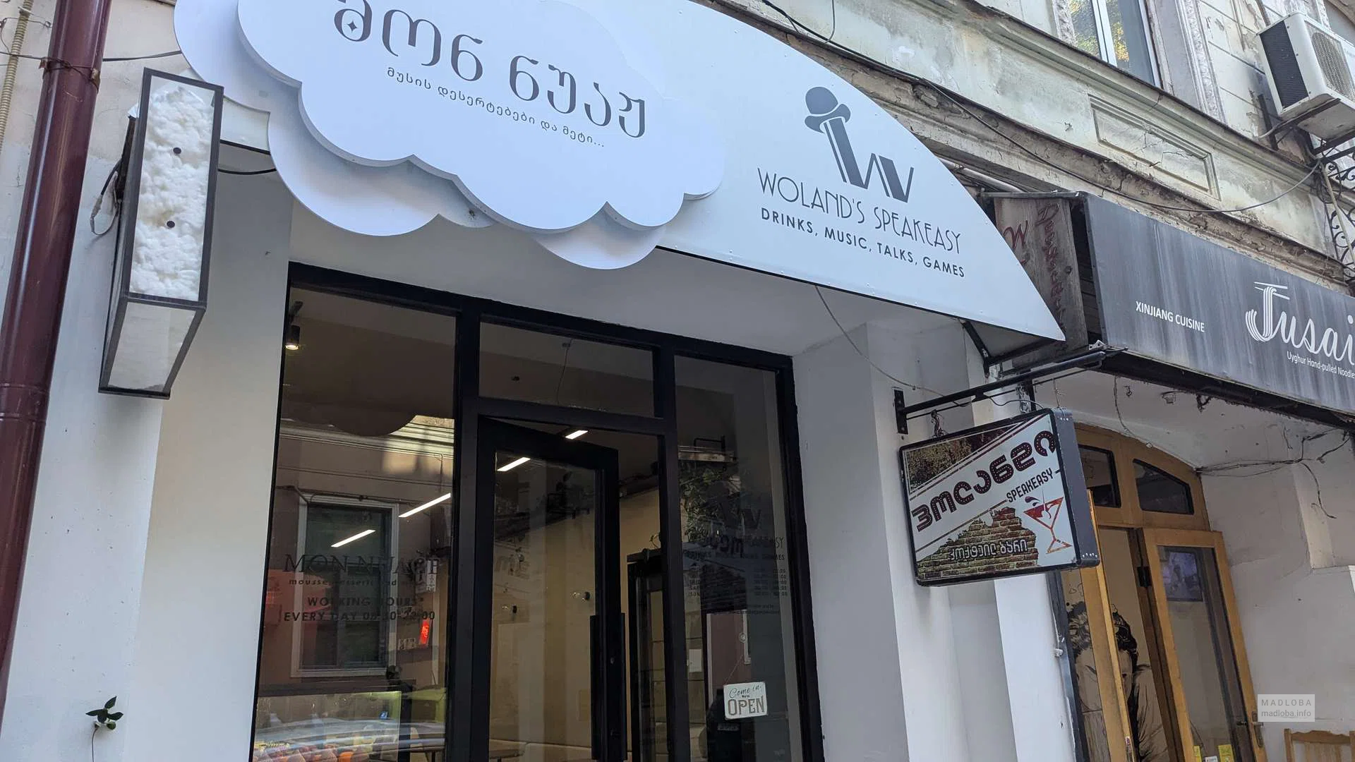 Необычный бар Woland’s Speakeasy в Тбилиси отличается своим загадочным расположением, тайный вход которого через книжную стену. Необычный интерьер бара в стиле 20-30х годов. Кирпичные стены зала с антикварным декором.