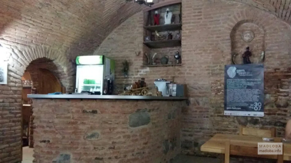 Атмосферное кафе - это настоящая таверна с прекрасным старинным интерьером: кирпичный зал, украшенный декором из растений, картин и тематических грузинских статуэток и деревянные широкие столы.