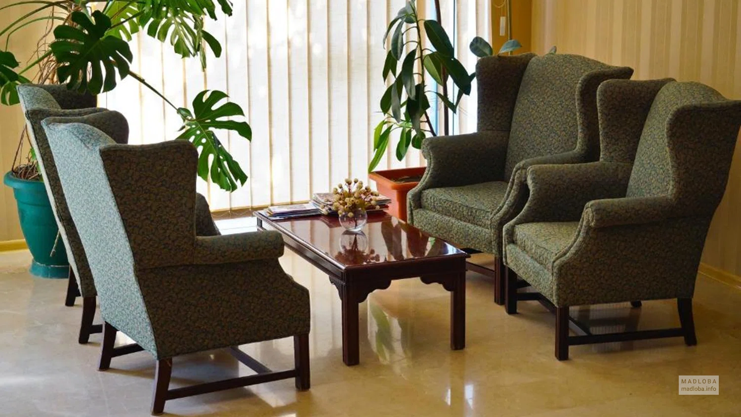 Интерьер современный, с легким налетом английской винтажности. В гостевой зоне мягкие кресла с высокими спинками, журнальный столик на тонких ножках у стены стоит пианино. На крыше отеля терраса с плетеной мебелью много зелени в глиняных горшках.