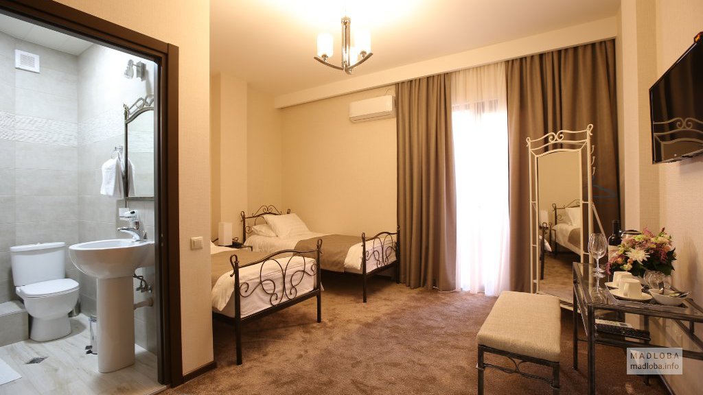 Отличный небольшой отель, оставил тёплые воспоминания. Номера в прекрасном состоянии. Всего девять комнат, всегда тихо. Есть уютный внутренний дворик, где приятно проводить время. Завтраки вполне хорошие. Главное — радушные хозяева. Мы прибыли ночью, и нас быстро разместили, даже угостили тем, что было. Сразу почувствовали грузинское гостеприимство. Мираб, хозяин, всегда помогает решать проблемы. У него есть отличное домашнее вино из Кахетии. Очень рекомендую!