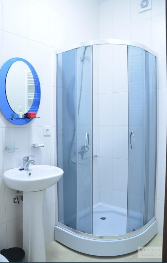 Для тех, кто должен хранить документы, в углу примостился небольшой сейф. В ванной установлен душ, на раковине стандартный комплект туалетных принадлежностей, есть фен.