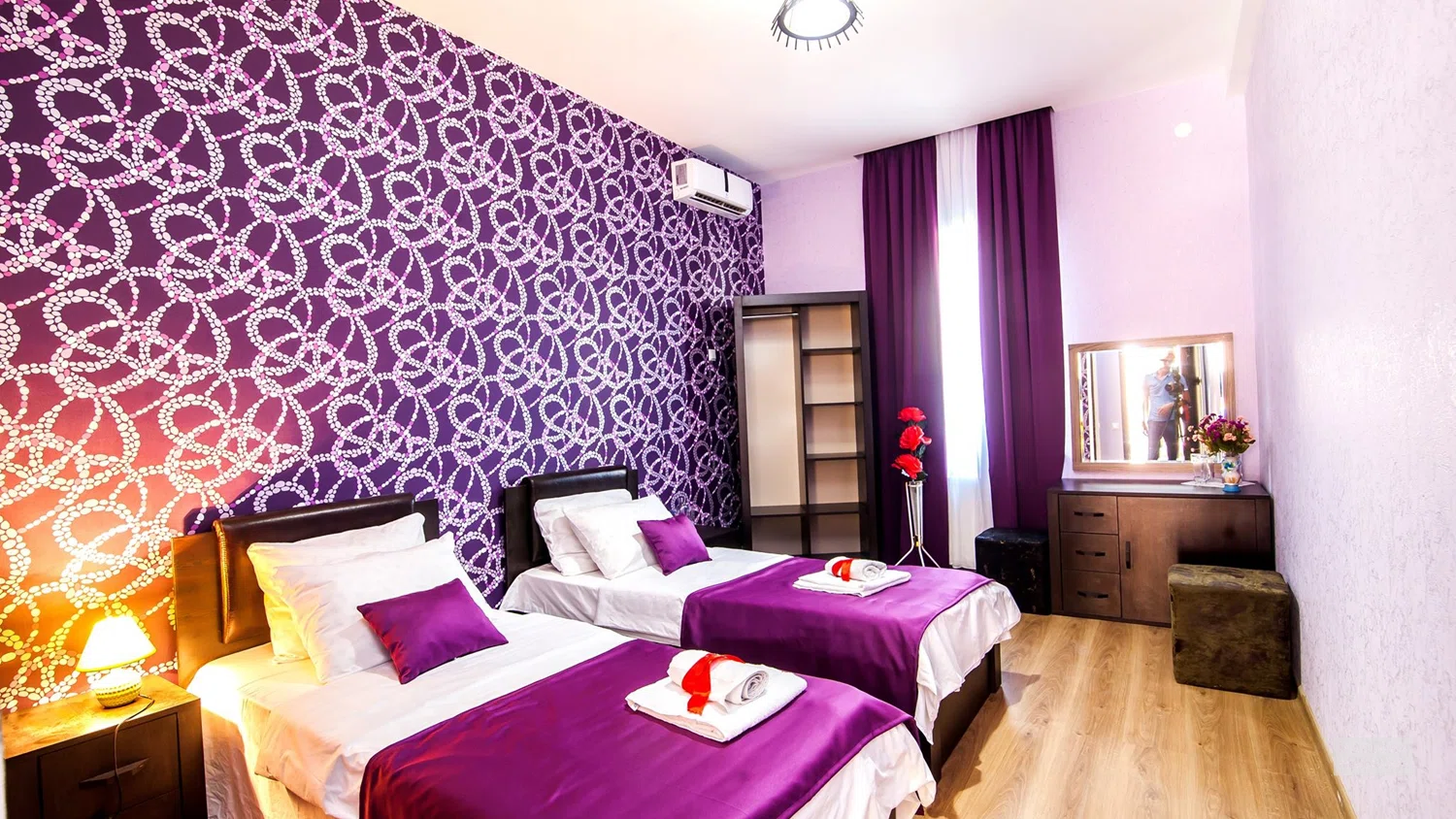 Номера ярко и стильно оформлены и располагают всем необходимым для комфортного размещения: телевизор со спутниковыми каналами, wi-fi, ванная комната с феном, кондиционер, отопление.
