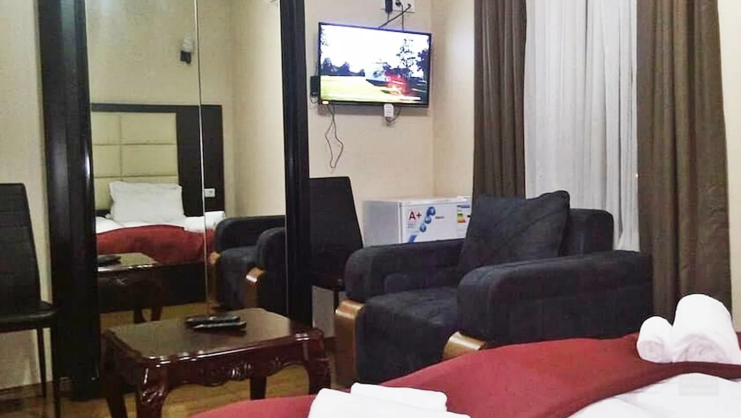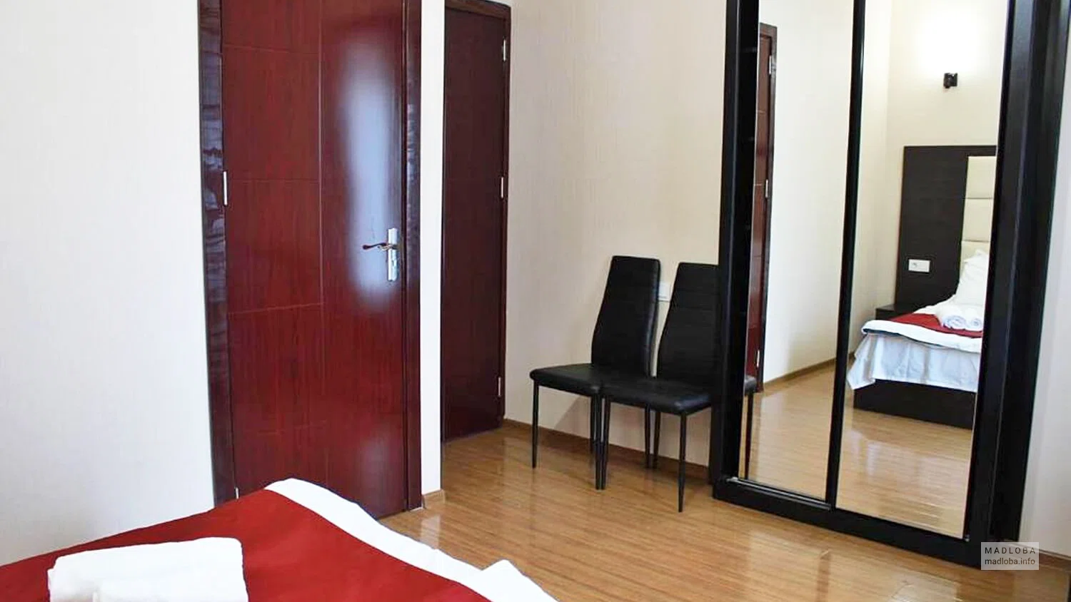 В некоторых номерах есть небольшой балкон с мебелью и гостиная зона.