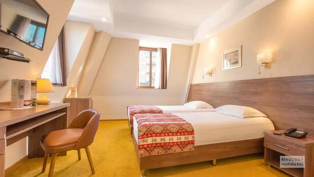 Двоякое впечатление от пребывания. Привлекла цена — 75 евро за две ночи. Расположение удобное, недалеко от метро Руставели, но путь к отелю вверх по крутой местности. Номера соответствуют скорее уровню трёх звёзд. В них нет халатов, гигиенического крана, шампуня и геля для душа — только жидкое мыло, которое есть и у раковины, и в душе. Вода в душевой кабине протекает на пол. На потолке в ванной заметны жёлтые следы подтёков. Кондиционеры плохо прогревают комнату. Мини-бар есть, и цены в нём адекватные. Ресторан на пятом этаже предлагает хороший вид на Тбилиси, но обедать там недёшево. Атмосфера в отеле приятная, и в итоге недостатки не особо омрачили впечатление, но до уровня четырёх звёзд отель явно не дотягивает.