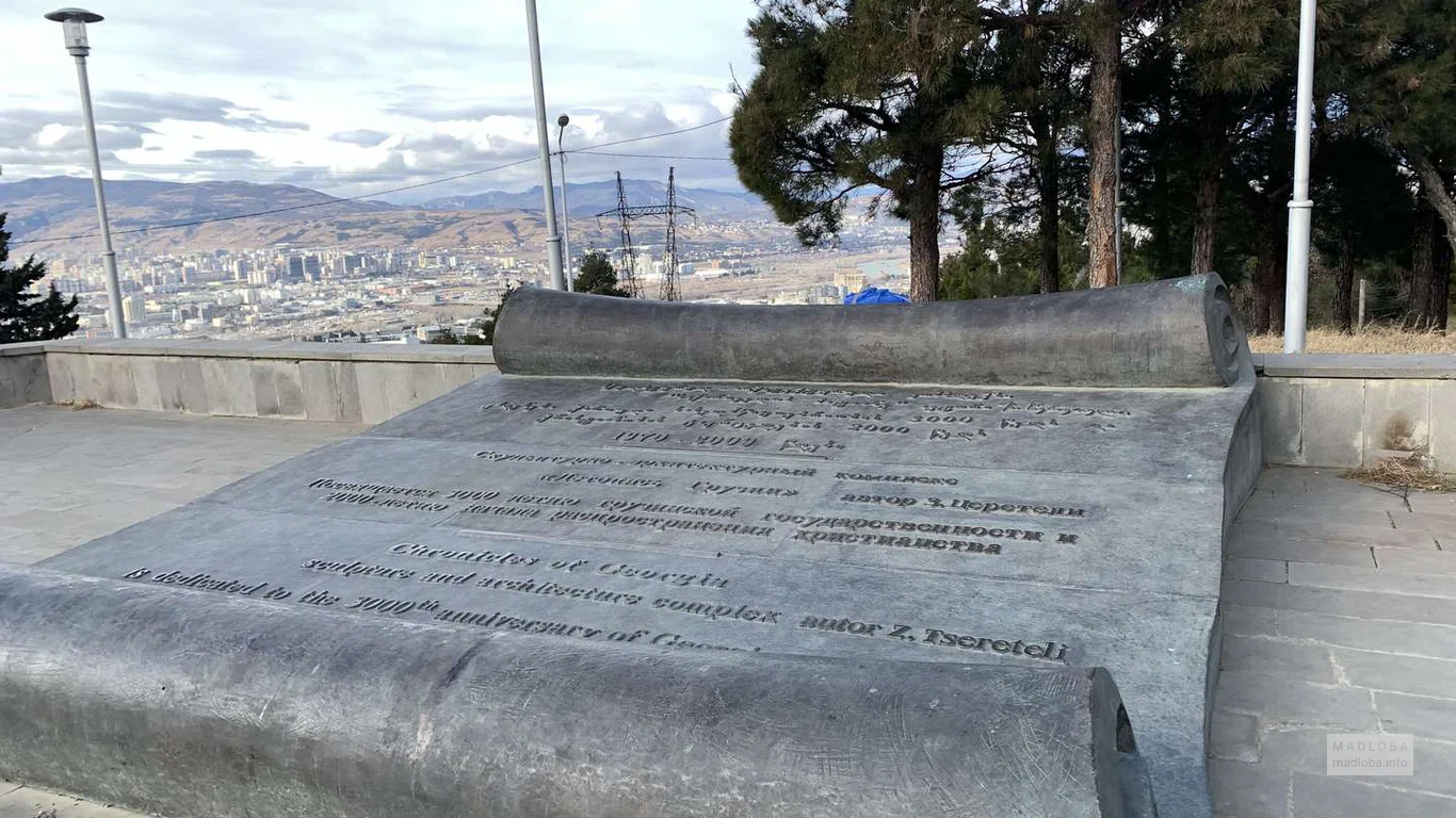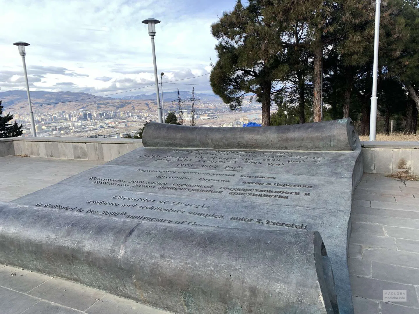 На первой площадке лежит каменный лист с названием "Летопись Грузии". Автором этого величественного ансамбля является грузинский скульптор Зураб Церетели. Создание этой работы заняло более 30 лет, начиная с 1985 года. Монумент представляет собой скульптурно-архитектурный комплекс площадью 8 тысяч квадратных метров, состоящий из 16 арочных колонн. Высота каждой колонны составляет 35 метров.