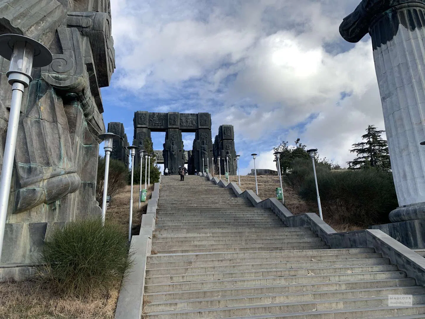 Перед комплексом нет официальных парковок, поэтому машины ставят где попало. Мемориал не имеет ограждения, перед входом стоит небольшой домик с охранником. Вход бесплатный, и можно свободно подняться по широкой лестнице, внизу которой стоят две античные колонны, напоминающие о давней истории Грузии.