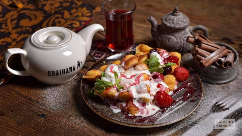 Десерты чизкейк, тирамису, торты, брауни. Здесь можно попробовать 27 наименований уникальных чаев. Любители кальяна наслаждаются кальяном N1 в Тбилиси.