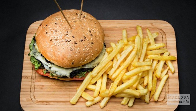 Из напитков вино, кофе, чай, пиво, джин. Подают алкоголь. Из блюд сыр, пицца, курица, паста, салаты, стейки и т.д.