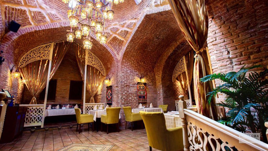 Интересный и колоритный интерьер зала, высокие потолки, арочные проходы , орнаментальные скатерти и картины Ресторан “Mepetubani” погрузит вас в атмосферу восточной сказки.