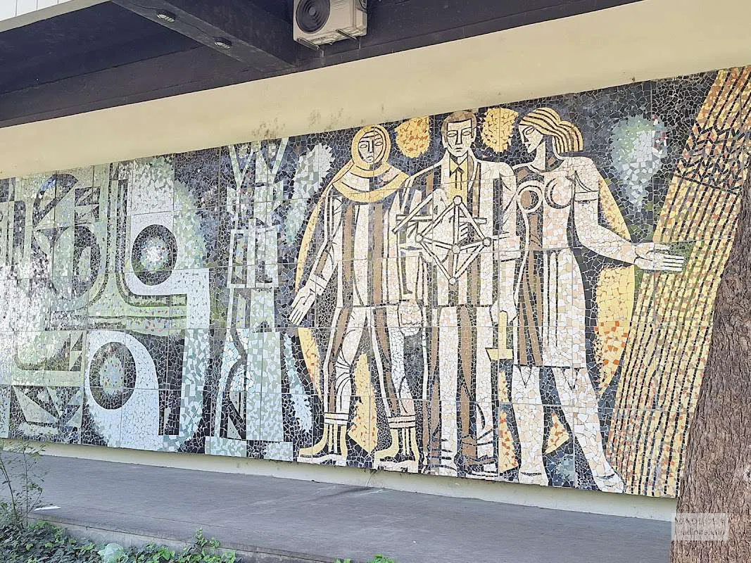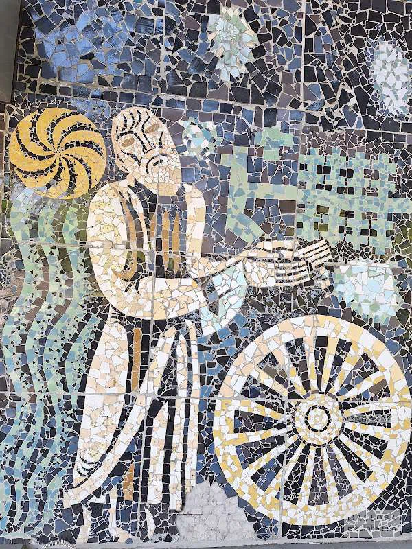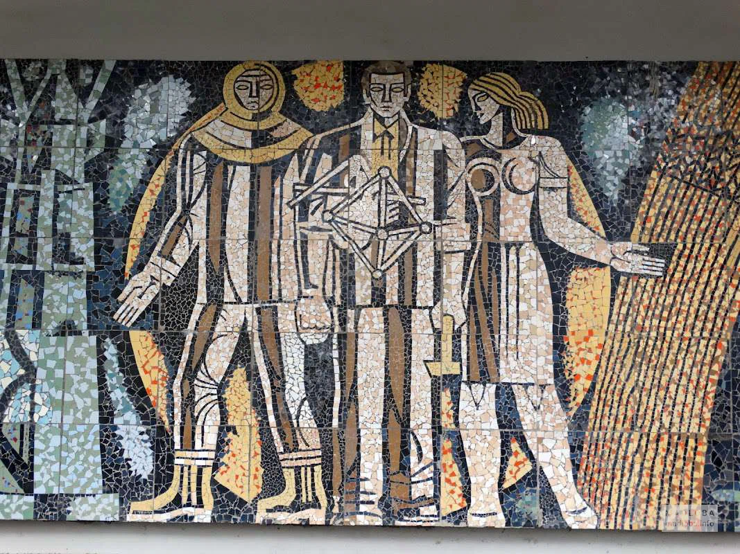 На мозаике изображены ученый с кристаллической решеткой, космонавт и аспирантка, символизирующие научный прогресс. Также представлены спутник, радиолокатор и ракета, отражающие достижения в освоении космоса.