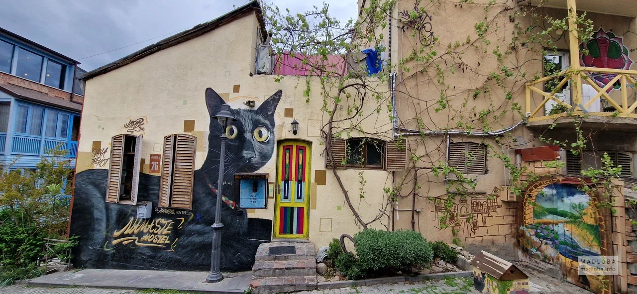 Этот мурал излучает невероятное тепло и уют, словно приветливый кот, приглашающий войти внутрь. Атмосфера в хостеле такая домашняя и дружелюбная, что кажется, будто все — одна большая семья. Если вы хотите найти место, где можно ощутить себя как дома, то это то самое место!