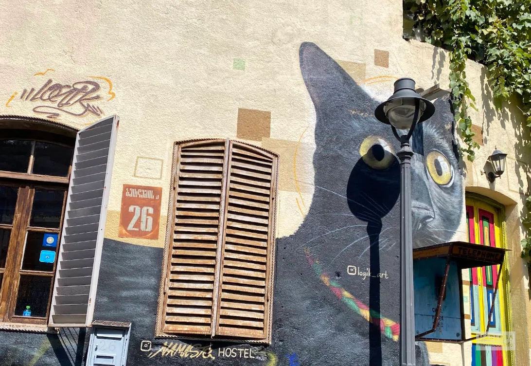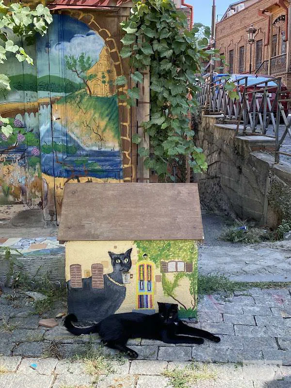 Un adorable gato negro en la zona antigua de Tbilisi. Shiva reside en un hostal y es muy cariñoso. ¡El mural es impresionante!