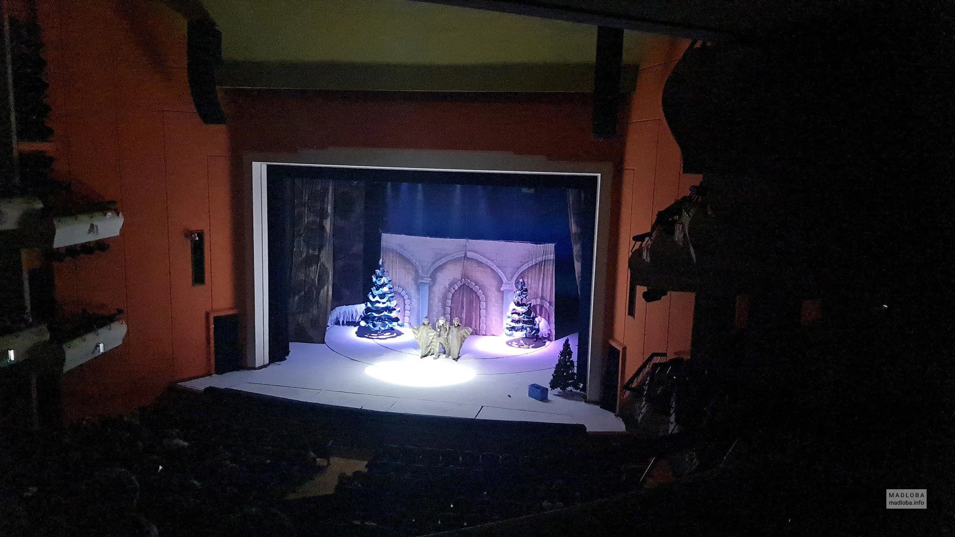 Театр изящен и сдержан. В фойе можно увидеть портреты режиссёров, работавших здесь в разные годы, а также костюмы из разных постановок — отличное место для фото. Вход в зал расположен на втором этаже, в то время как гардероб и туалеты — на первом. В женской уборной четыре кабинки, так что в антракте можно воспользоваться туалетом в соседнем торговом центре. Зал не слишком большого размера, но с великолепной люстрой на потолке и широкой сценой. Кресла мягкие и удобные, с третьего ряда всё хорошо видно, аппаратура не мешает обзору, хотя в зале прохладно. Посмотрела спектакль "Не горюй!". Интересно было сравнить его с известным фильмом. Получилось хорошее прочтение истории: зачем-то добавили новые элементы, что лишь улучшает общее впечатление. Декорации простые, но впечатлил автомобиль, ему уделено особое внимание. Понравились и "условные двери", которые вовремя появлялись на сцене. Спектакль идёт на русском, а песни на грузинском, что не требует перевода — они идеально вплетаются в сюжет.