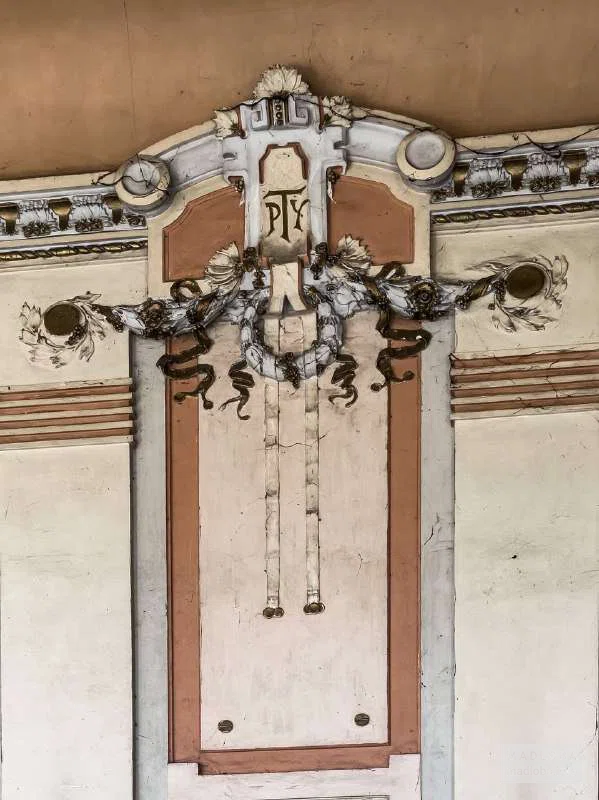 Высокие потолки, лепнина, арочные окна и остатки декоративных элементов сохранились даже несмотря на ветшающее состояние здания. Сегодня оно заселено беженцами, но архитектурная ценность осталась нетронутой. Всё внутри дышит временем.