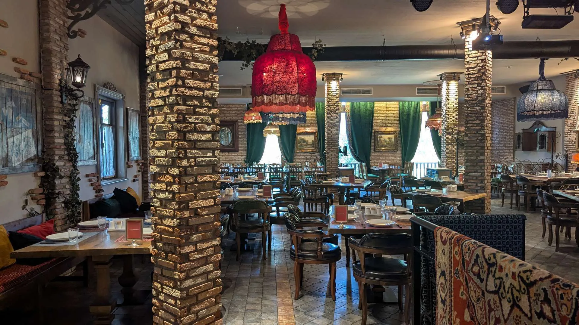 Ресторан располагает как внутренними залами, так и отдельными зонами на свежем воздухе, укрытыми тентами. Даже в летнюю жару здесь прохладно и комфортно. Отличный выбор как для тихого ужина, так и для торжеств: есть живая музыка, отдельная территория, Wi-Fi, доставка и парковка. А внимательные официанты только усиливают общее впечатление.